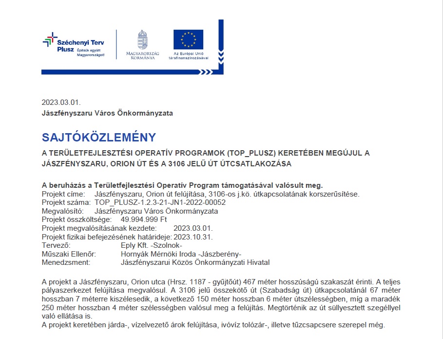 SAJTÓKÖZLEMÉNY – A területfejlesztési operatív programok (TOP_PLUSZ) keretében megújul a Jászfényszaru, Orion út és a 3106 jelű út csatlakozása 2023. szeptember 4. | Hírek